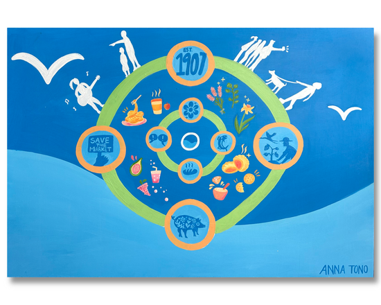 Final piece from a live painting session for the Downtown Seattle Association’s Paint in the Plaza program. Community responses gathered via an online survey shaped the imagery, highlighting Pike Place Market’s historic keystones and the everyday joys visitors experience today. -